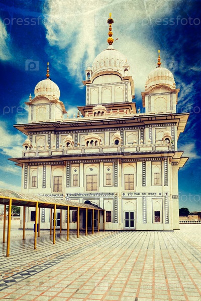 Винтажное ретро-хипстерское туристическое изображение сикхской гурдвары с наложенной гранжевой текстурой с наложенной гранжевой текстурой. Форт Гвалиор, Мадья-Прадеш, Индия