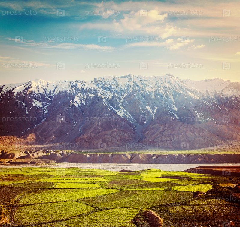 Винтажное ретро-хипстерское туристическое изображение долины Спити - заснеженных Гималайских гор. Химачал-Прадеш, Индия