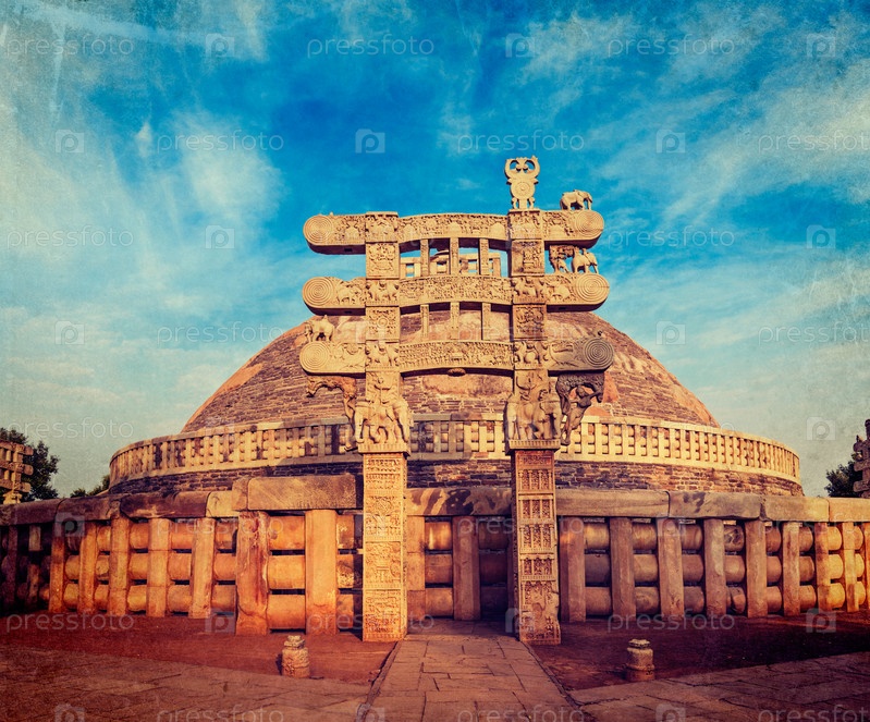 Винтажное ретро-хипстерское туристическое изображение Великой Ступы - древнего буддийского памятника с наложенной гранжевой текстурой. Санчи, Мадхья-Прадеш, Индия