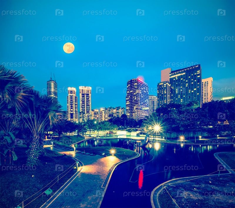 Винтажное ретро-хипстерское туристическое изображение горизонта центрального делового района Куала-Лумпура ночью, Малайзия