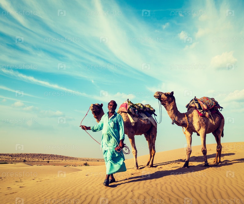 Винтажное ретро-хипстерское изображение путешествия в стиле Раджастхана - индийский погонщик верблюдов (погонщик верблюдов) с верблюдами в дюнах пустыни Тар. Джайсалмер, Раджастхан, Индия