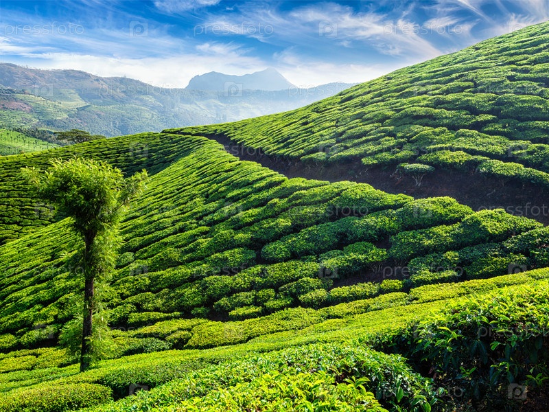 Плантации зеленого чая утром, Муннар, штат Керала, Индия
