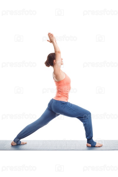 Женщина практикует асану йоги уттхита Вирабхадрасана