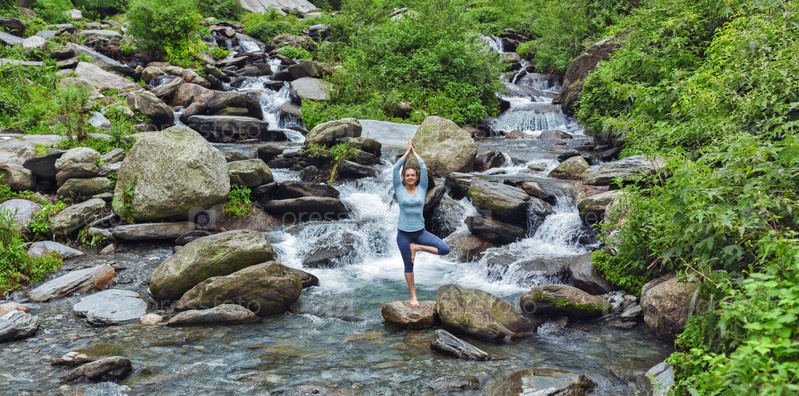 Женщина занимается йогой асанами в позе дерева у водопада