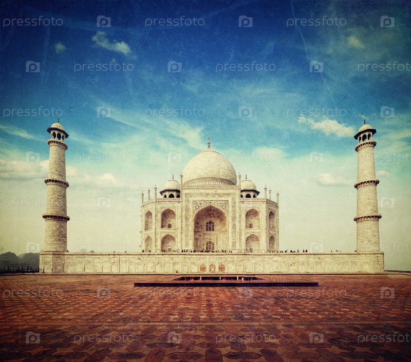 Винтажный ретро-хипстерский образ путешествия Тадж-Махала. Индийский символ - туристический фон Индии с наложенной гранжевой текстурой. Агра, Индия