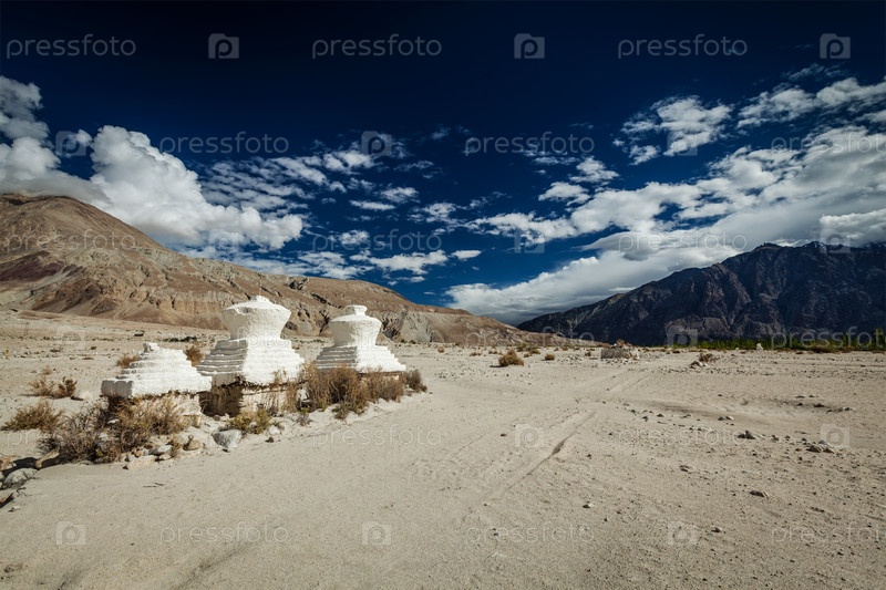 Чортенс (ступа тибетского буддизма) в Гималаях. Долина Нубра, Ладакх, Индия