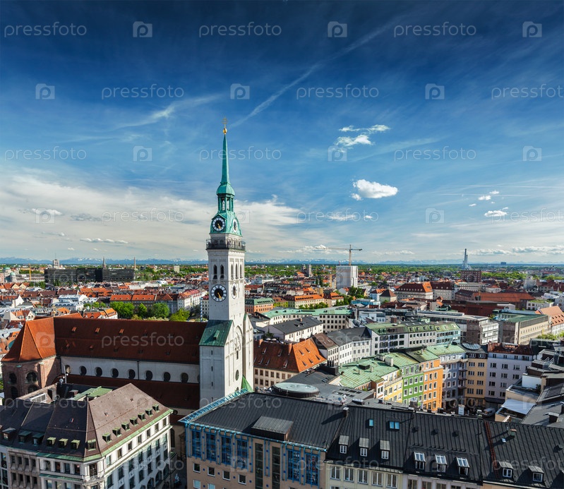 Вид с воздуха на Мюнхен и церковь Святого Петра - Мариенплац и Альтес Ратхаус, Бавария, Германия