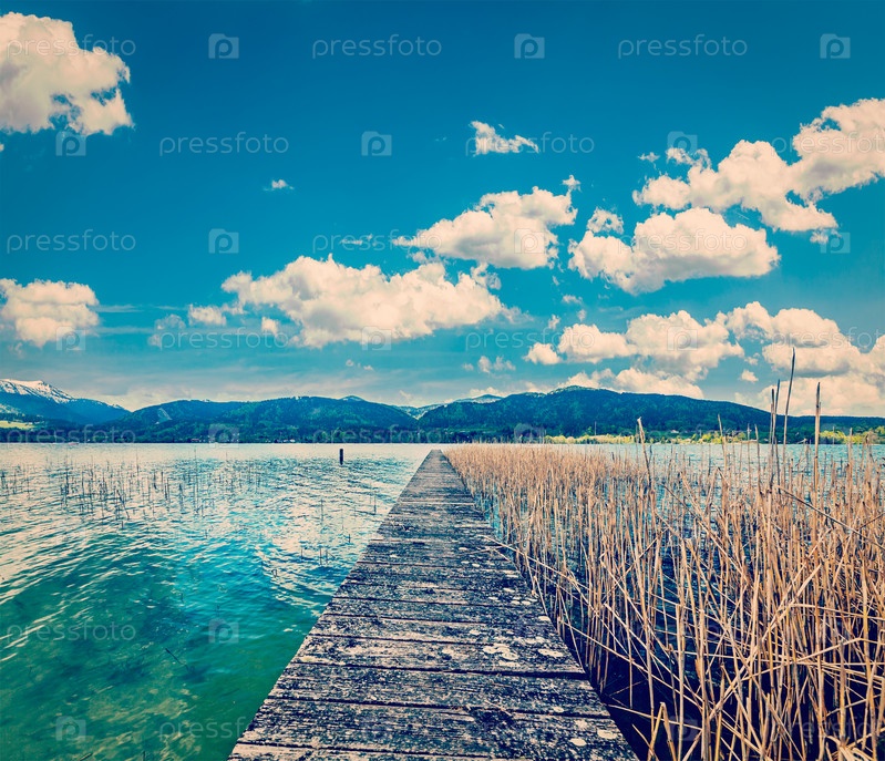 Винтажный ретро-эффект отфильтрован в хипстерском стиле туристического изображения пирса на озере в сельской местности, Бавария, Германия