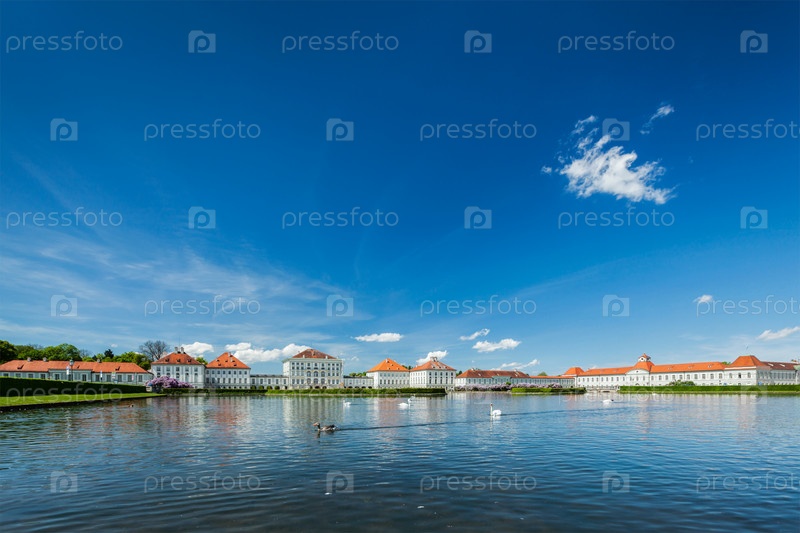 Лебеди и утки в искусственном бассейне перед дворцом Нимфенбург. Мюнхен, Бавария, Германия