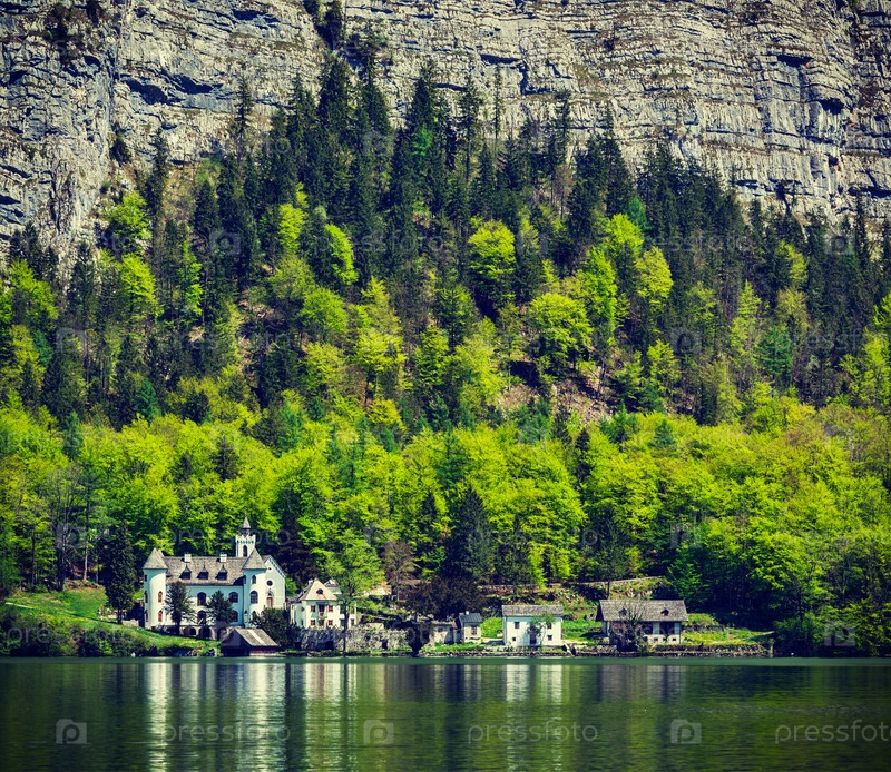 Винтажный ретро-эффект отфильтровал туристический образ замка в стиле хипстера в Гальштаттер-Си, горное озеро в Австрии. Зальцкаммергут, Австрия