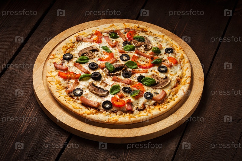 Пицца с ветчиной с перцем, грибами, оливками и листьями базилика на деревянной доске на старом столе