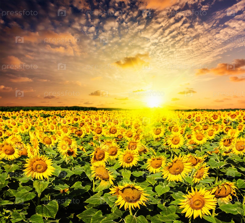 Идиллический живописный пейзаж - поле подсолнечника на закате с драматическим облачным пейзажем