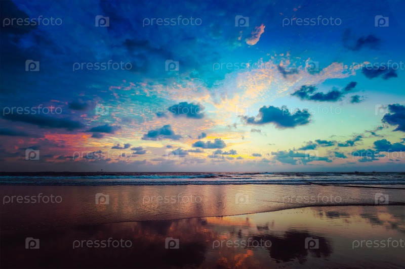 Винтажный ретро-хипстерский образ путешествия в стиле тропических каникул - закат на идиллическом пляже. Бага, Гоа, Индия