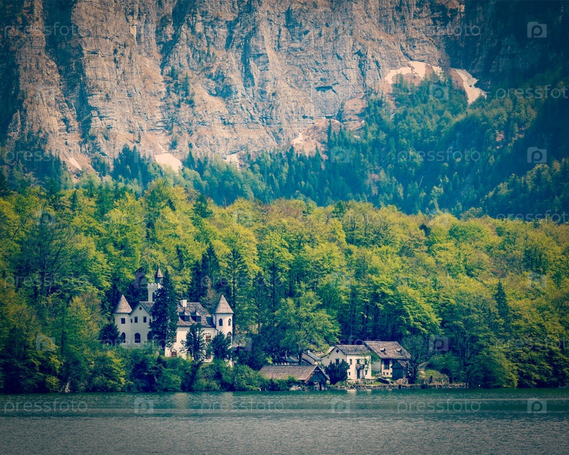 Винтажный ретро-эффект отфильтровал туристический образ замка в стиле хипстера в Гальштаттер-Си, горное озеро в Австрии. Зальцкаммергут, Австрия