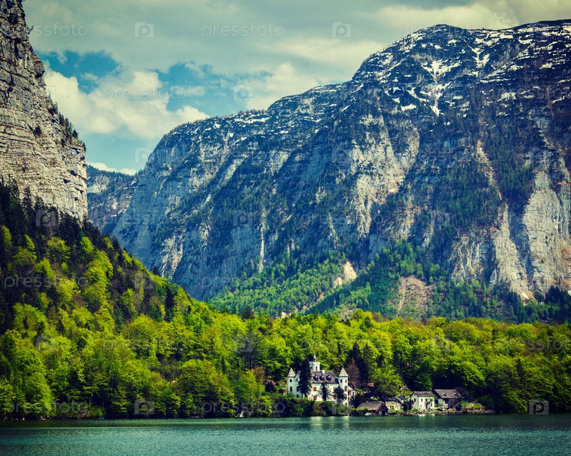Винтажный ретро-эффект отфильтровал туристический образ замка в стиле хипстера в Гальштаттер-Си, горное озеро в Австрии. Зальцкаммергут, Австрия