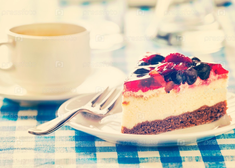 Торт на тарелке с вилкой и чашкой кофе