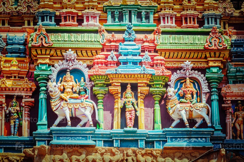 Винтажное ретро-хипстерское туристическое изображение Шивы и Парвати на изображениях быка. Скульптуры на башне Гопура индуистского храма. Храм Минакши, Мадурай, Тамилнад, Индия