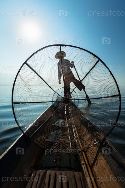 Достопримечательность Мьянмы - традиционный бирманский рыбак с рыболовной сетью на озере Инле в Мьянме, известный своим характерным стилем гребли на одной ноге, вид с лодки