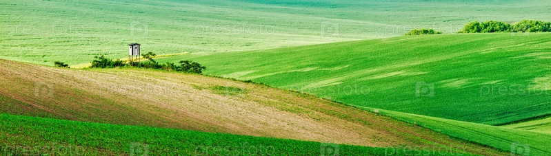 Панорама моравского холмистого ландшафта с хижиной охотничьей башни на закате. Моравия, Чехия