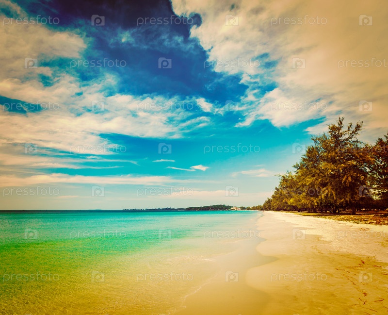 Винтажный ретро-эффект отфильтровал изображение хипстерского стиля пляжа Сиануквиль с красивым облачным пейзажем неба, Камбоджа