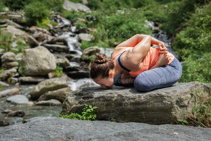 Молодая женщина занимается йогой на открытом воздухе у водопада