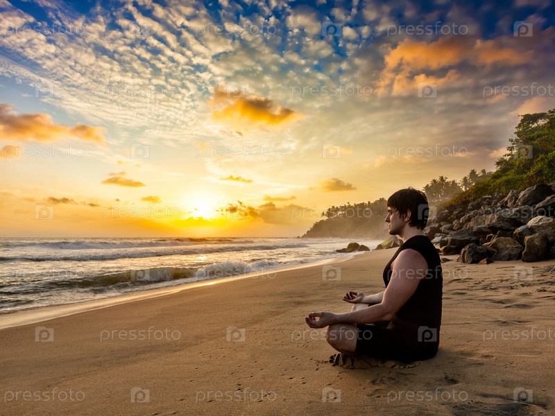 Молодой здоровый мужчина занимается йогой-медитацией на тропическом пляже