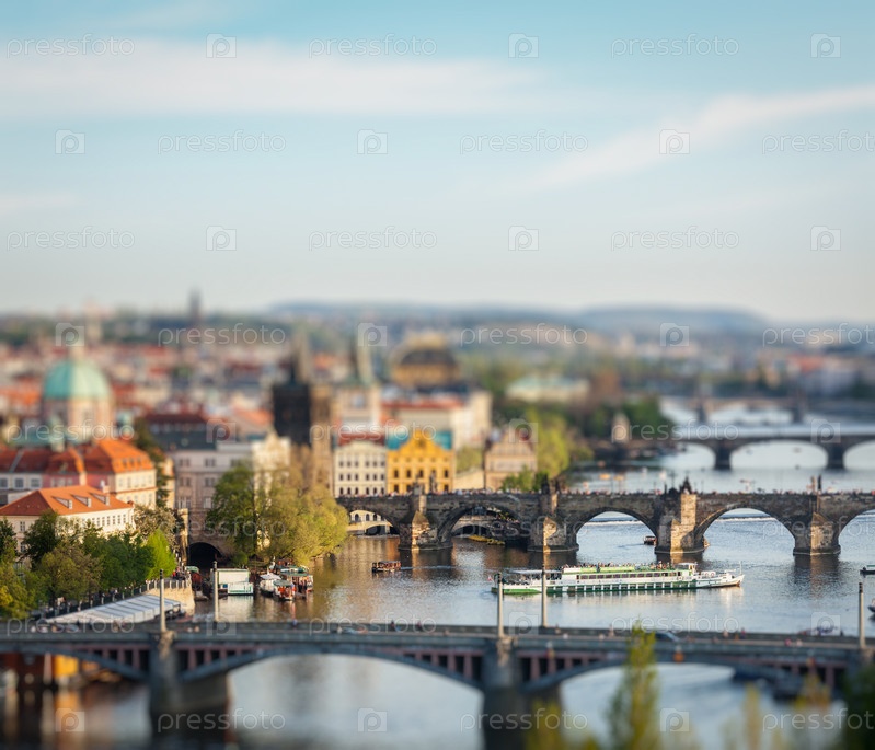 Концепция путешествия по Праге - повышенный вид на мосты через реку Влтава из парка Летна с игрушечным эффектом наклона и малой глубиной резкости. Прага, Чехия