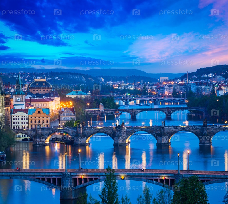 Концепция путешествия по Праге - вид на мосты через реку Влтава из парка Летна. Прага, Чехия в сумерках