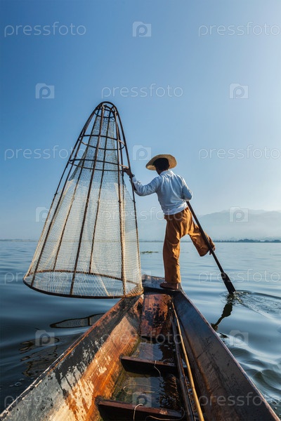 Достопримечательность Мьянмы - традиционный бирманский рыбак с рыболовной сетью на озере Инле в Мьянме, известный своим характерным стилем гребли на одной ноге, вид с лодки