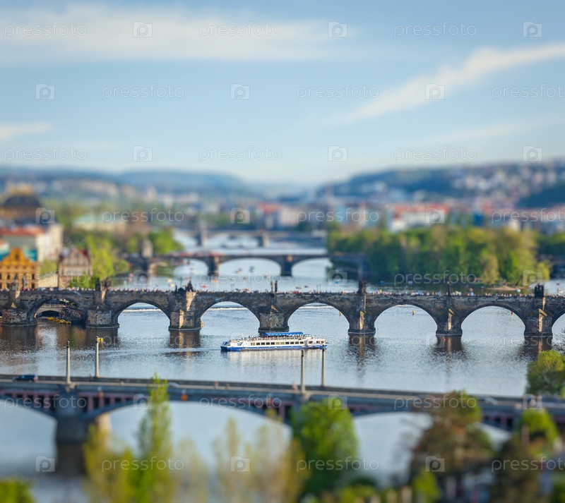 Концепция путешествия по Праге - повышенный вид на мосты через реку Влтава из парка Летна с игрушечным эффектом наклона и малой глубиной резкости. Прага, Чехия
