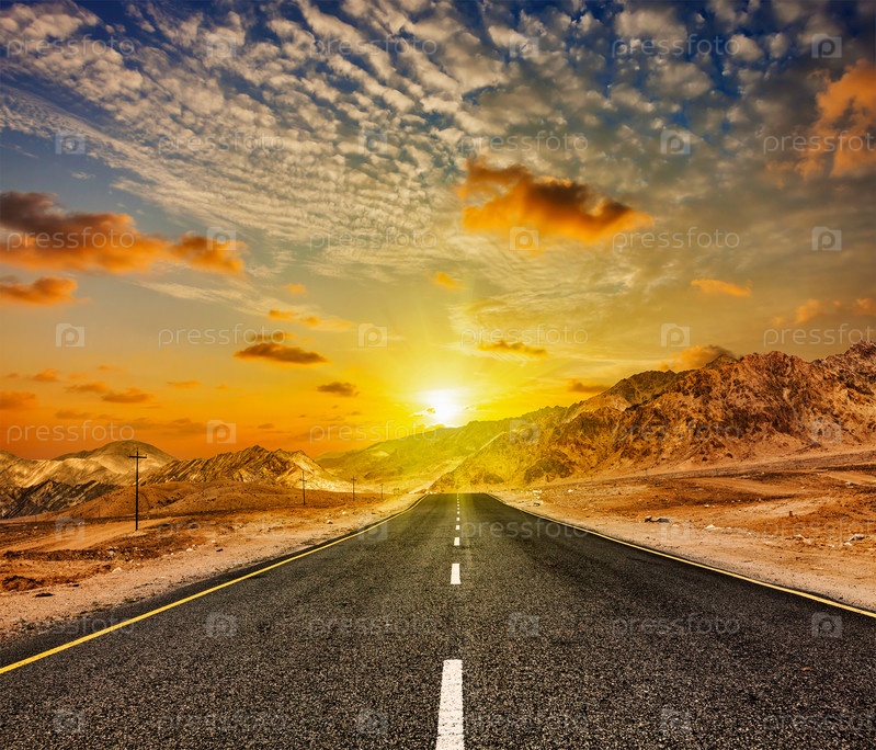 Путешествие вперед концептуальный фон - дорога в Гималаях с горами и драматическими облаками на закате. Ладакх, Джамму и Кашмир, Индия
