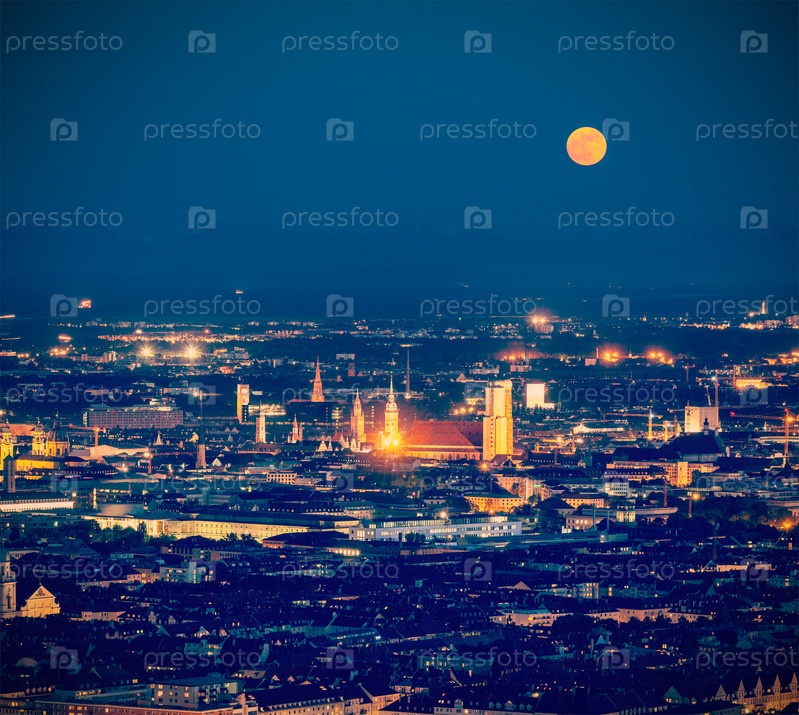 Винтажное ретро-хипстерское туристическое изображение ночного Мюнхена с воздуха с Олимпиатурма (Олимпийской башни). Мюнхен, Бавария, Германия