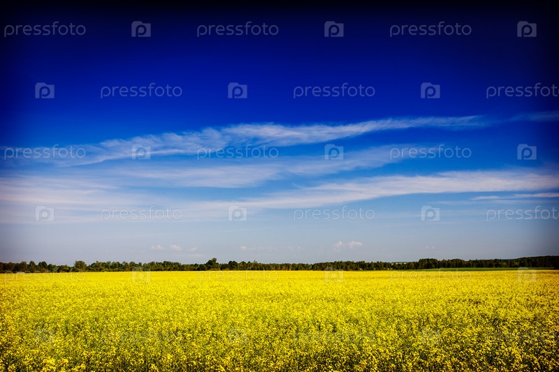 Винтажное ретро-хипстерское туристическое изображение весенне-летнего фона - желтое поле рапса (рапса) с голубым небом