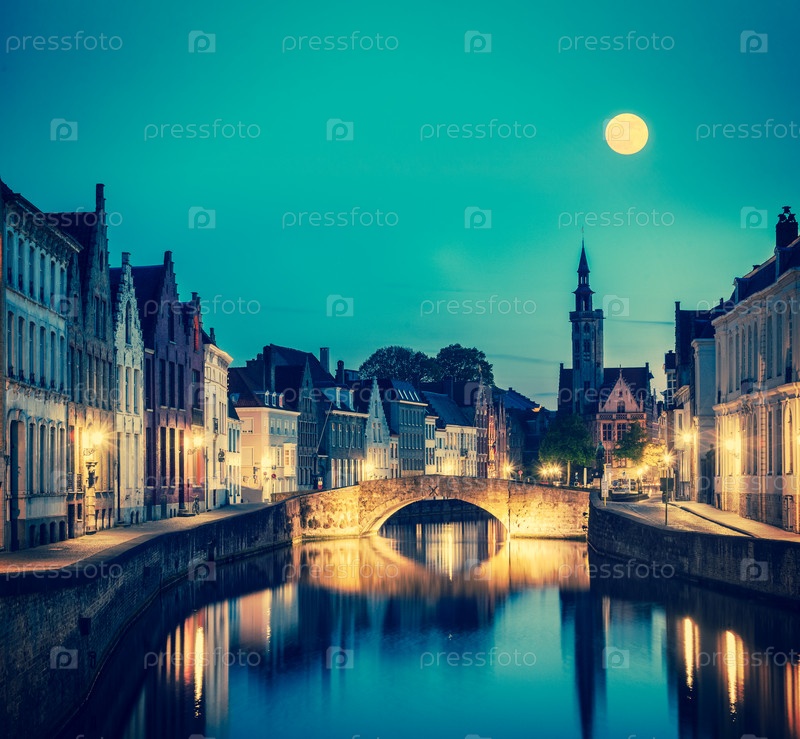 Винтажное ретро-хипстерское туристическое изображение европейского средневекового ночного города с видом на фон - канал Брюгге (Брюгге) вечером, Бельгия