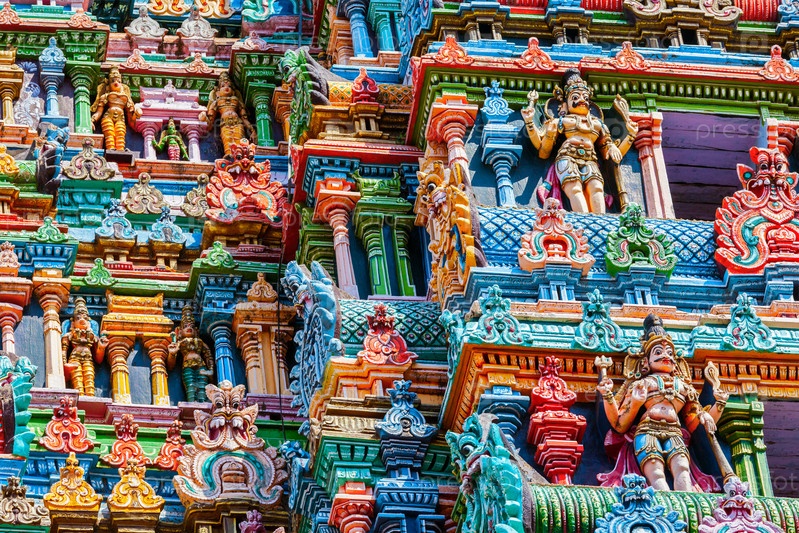 Скульптуры на башне Гопура индуистского храма. Храм Минакши, Мадурай, Тамил Наду, Индия