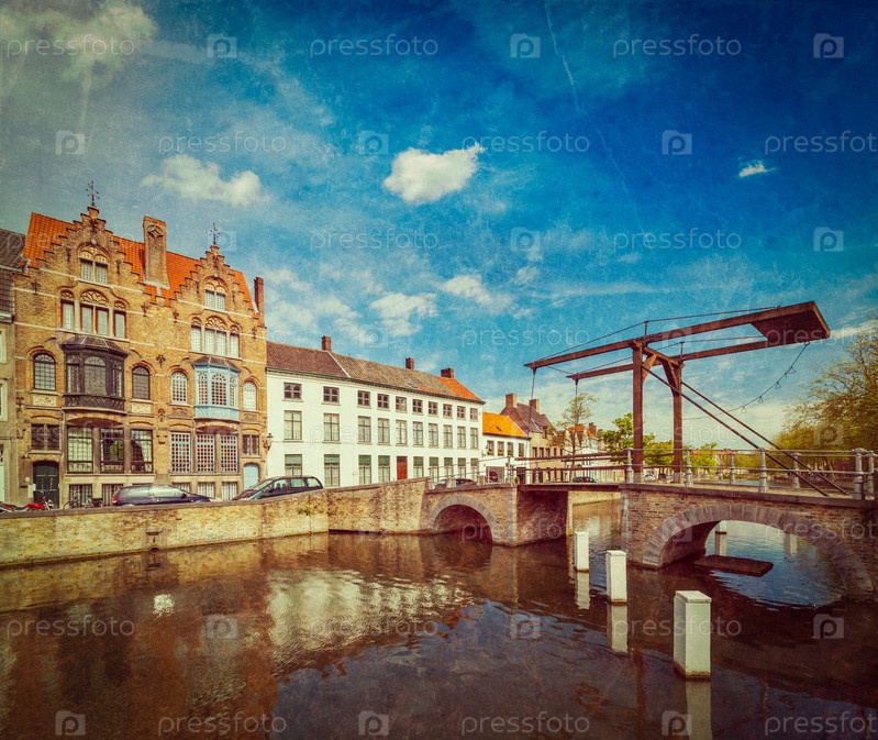 Винтажный ретро-хипстерский образ путешествия в стиле канала со старым мостом. Брюгге (Брюгге), Бельгия с наложенной гранжевой текстурой