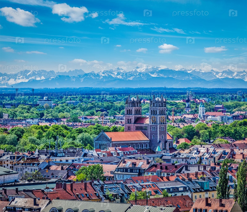 Вид с воздуха на Мюнхен с Баварскими Альпами сзади