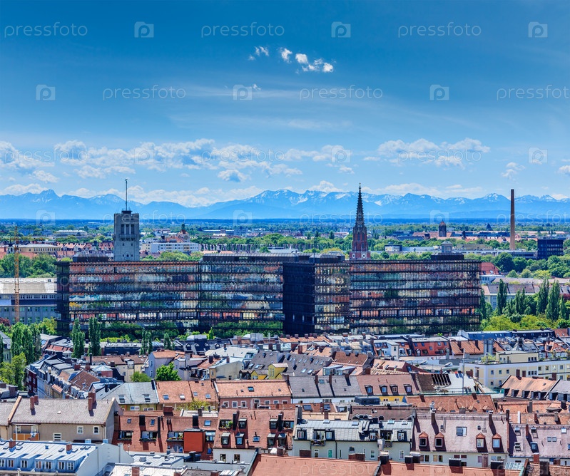 Вид с воздуха на Мюнхен с Баварскими Альпами сзади
