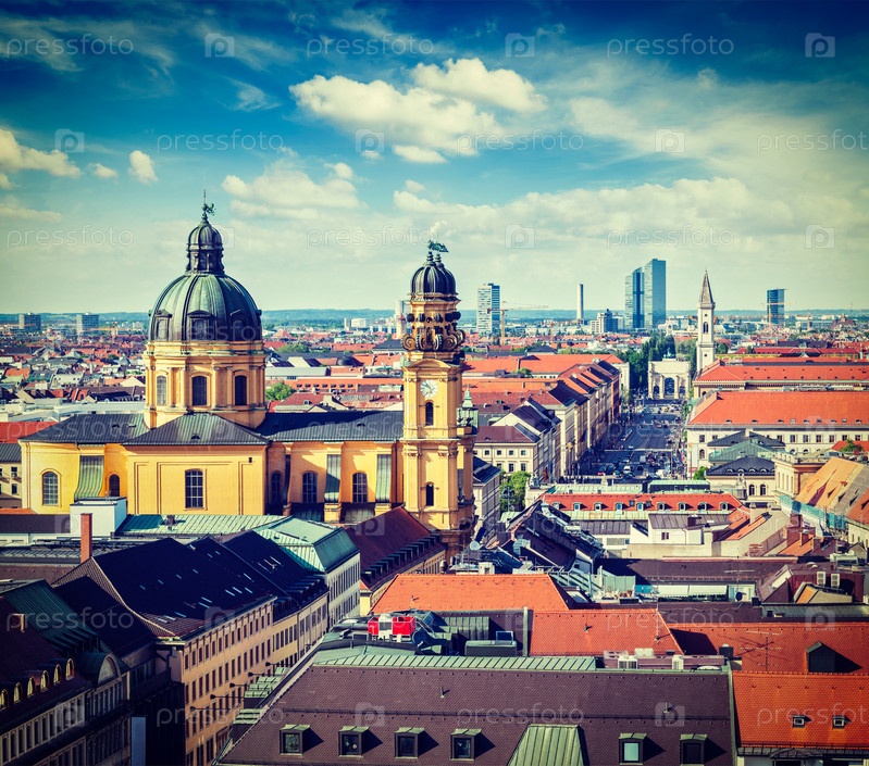Винтажный ретро-эффект отфильтрован в хипстерском стиле, туристическое изображение Мюнхена с воздуха над Театинской церковью Св. Каэтана Театинеркирхе Св. Каэтана и Одеонплац, Мюнхен, Бавария, Германия
