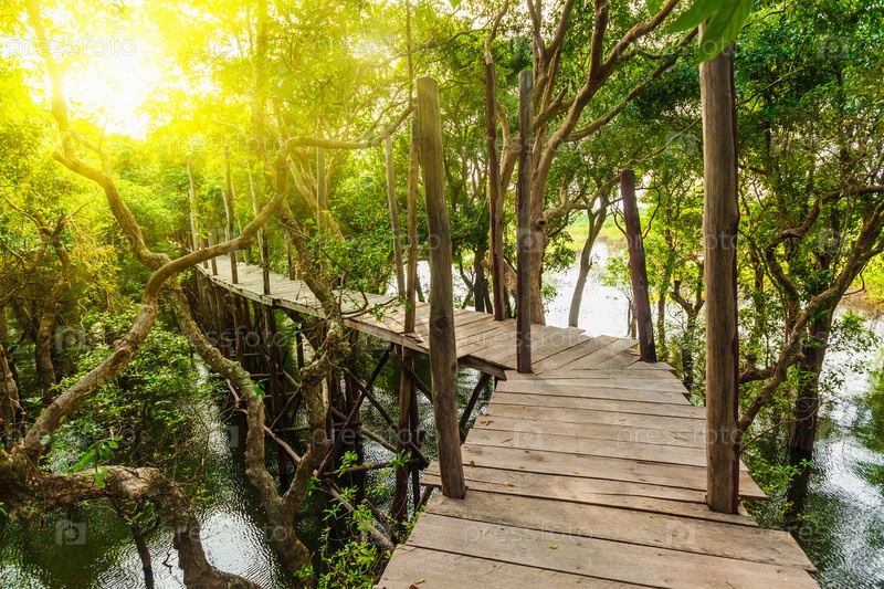 Концепция тропического экзотического путешествия - деревянный мост в затопленных тропических лесных джунглях мангровых деревьев недалеко от деревни Кампонг Плук, Камбоджа