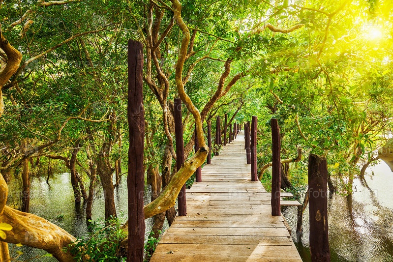 Деревянный мост в затопленных тропических лесных джунглях мангровых зарослей