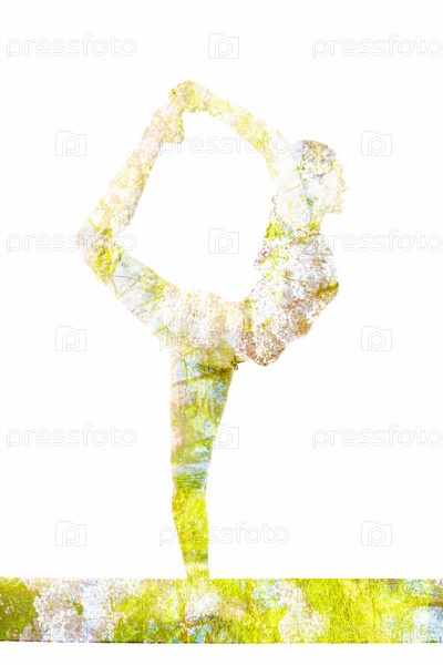Изображение двойной экспозиции женщины, занимающейся асанами йоги