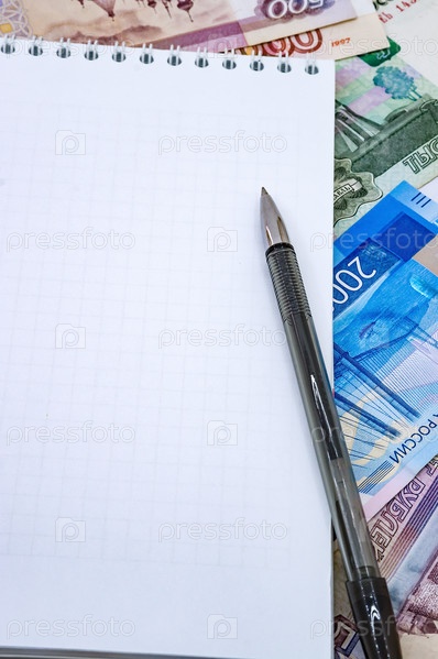Черная ручка и блокнот. Русские деньги и блокнот для заметок. Бумажные деньги и белый лист