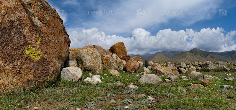 Кыргызстан, Чолпон-Ата. Огромные камни рассыпанные по большей площади в музее петроглифов под открытым небом на северном берегу озера Иссык-Куль. Их возраст составляет 2000-5000 лет