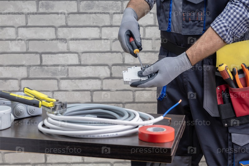 Электрик, работающий с автоматическим выключателем. ремонт, реконструкция дома и концепция разнорабочего