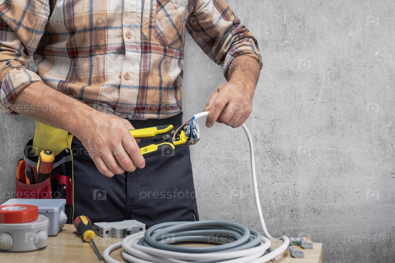 Электрик очищает защитную изоляцию провода с помощью инструмента для зачистки проводов