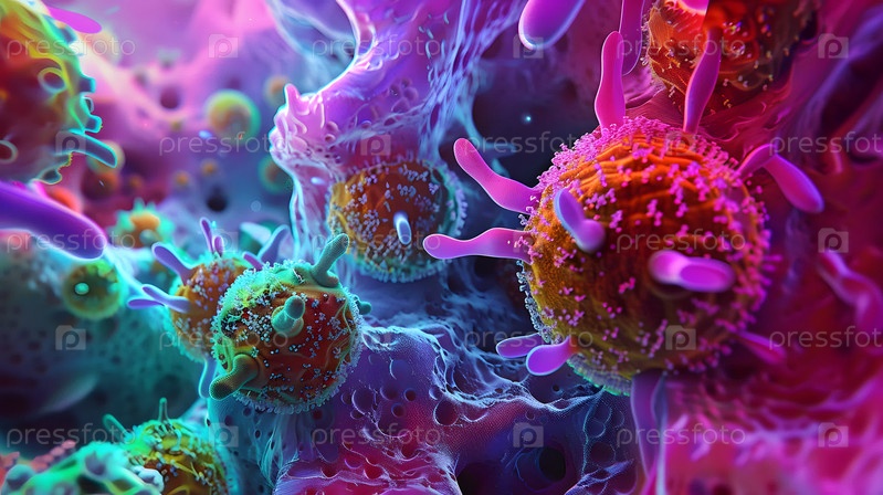 Красивый микромир, микробы различных форм и цветов, 3D иллюстрация