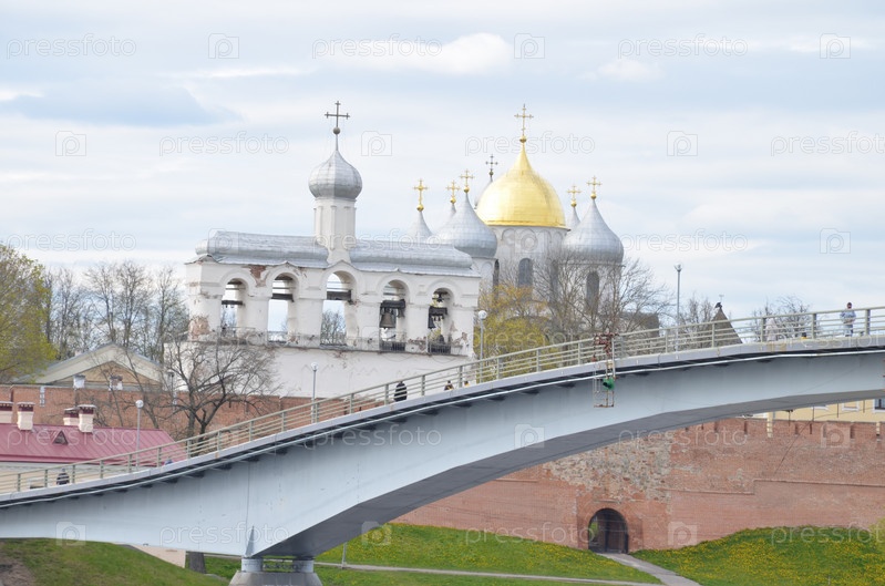 Вид на Кремль Великого Новгорода: Софийский собор (православный храм XI века), Звонница Софийского собора, крепостные стены, Горбатый мост