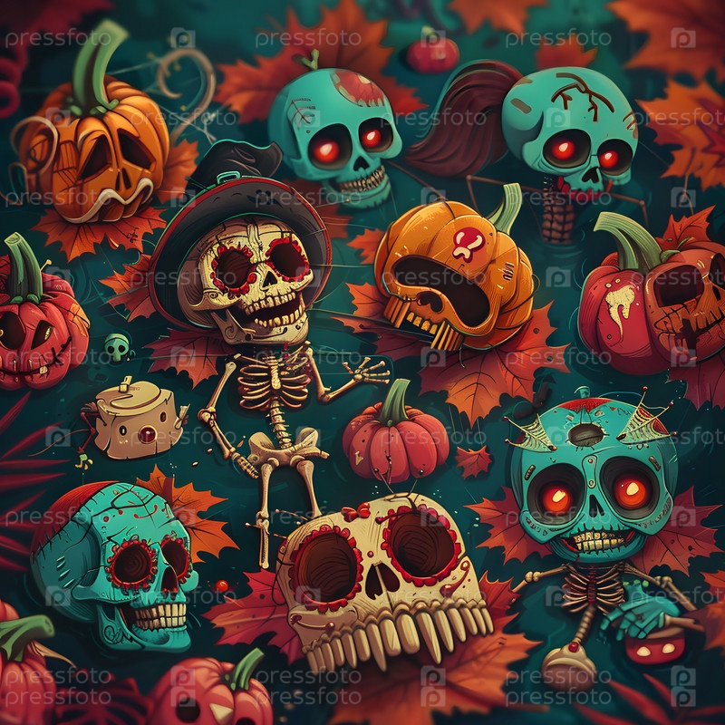 Очаровательный детский мультфильм, милые скелеты, черепа, кости, Хэллоуин, морда с лицами и подмигивающими глазами, пастельные яркие цвета, набор коллекции, детская иллюстрация, обои