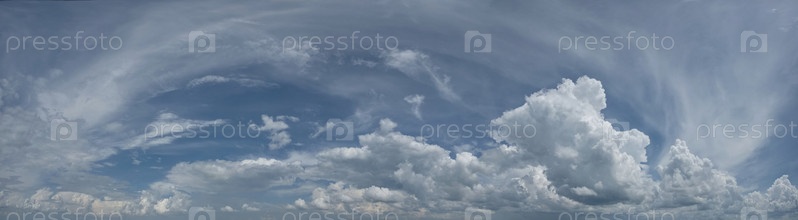 Россия. Юг Западной Сибири. Панорама дневного летнего неба с кучевыми облаками над полями Кузнецкого Алатау